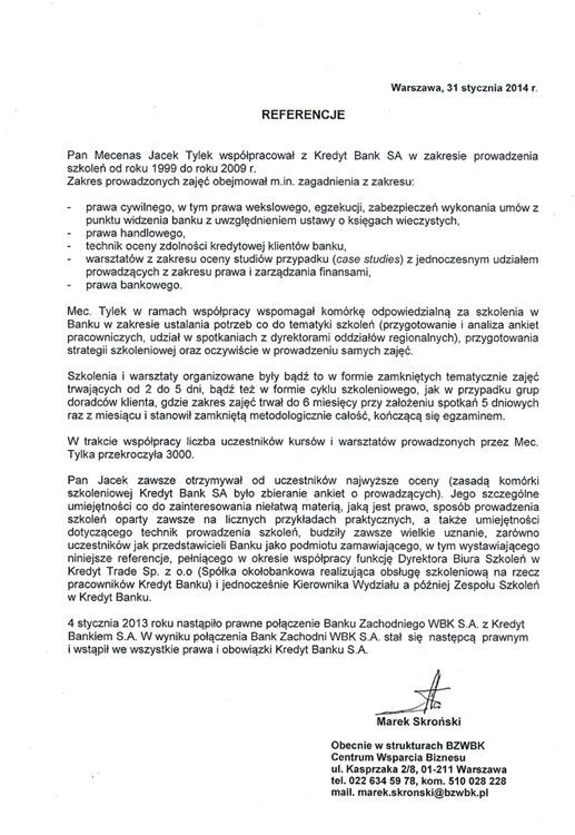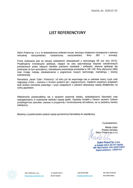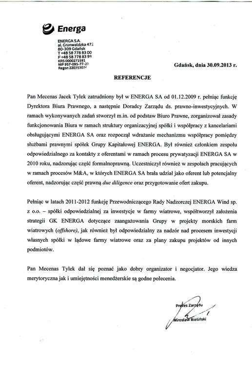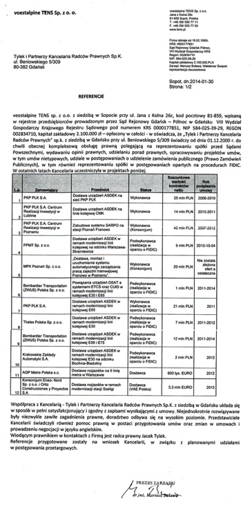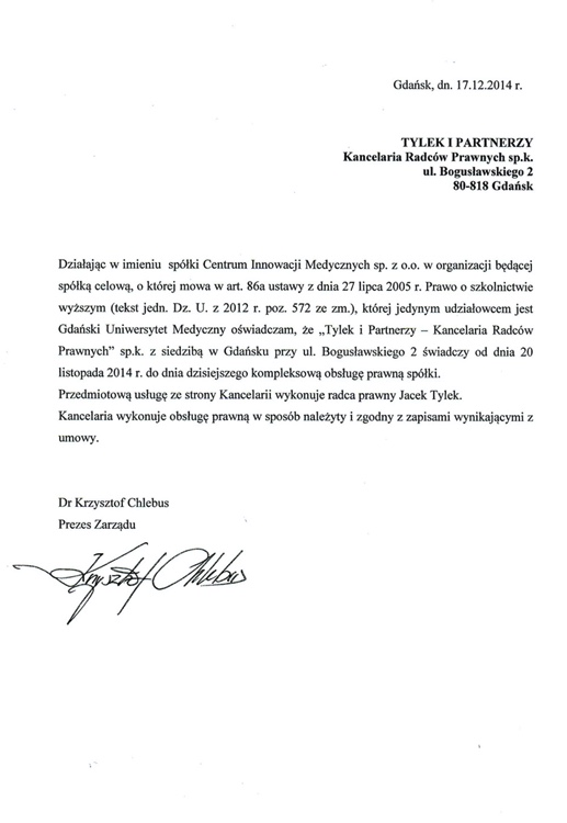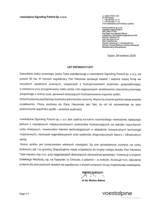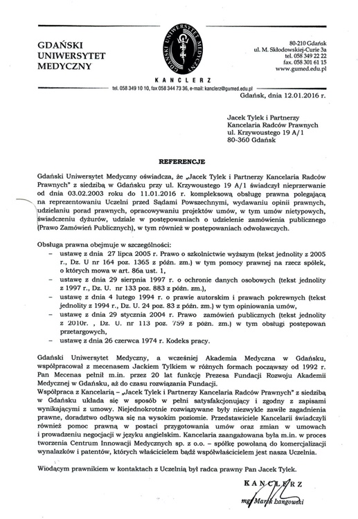 We have been providing legal services inter alia to the following: Medical University of Gdańsk, University Clinical Centre, St. John Hospital in Starogard Gdański, Hospital in Miastko sp. z o.o., Metropolitan Curia in Gdańsk, Elektrociepłownia Wybrzeże S.A., voestalpine Signaling Poland sp. z o.o., and other.