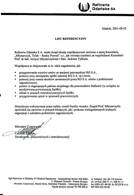 The Firm has been collaborating with enterprises operating in the maritime business as follows: PPPiH DALMOR S.A., Polskie Linie Oceaniczne S.A., Stocznia Północna S.A., Unity Line sp. z o.o., WTC Gdynia sp. z o.o.
